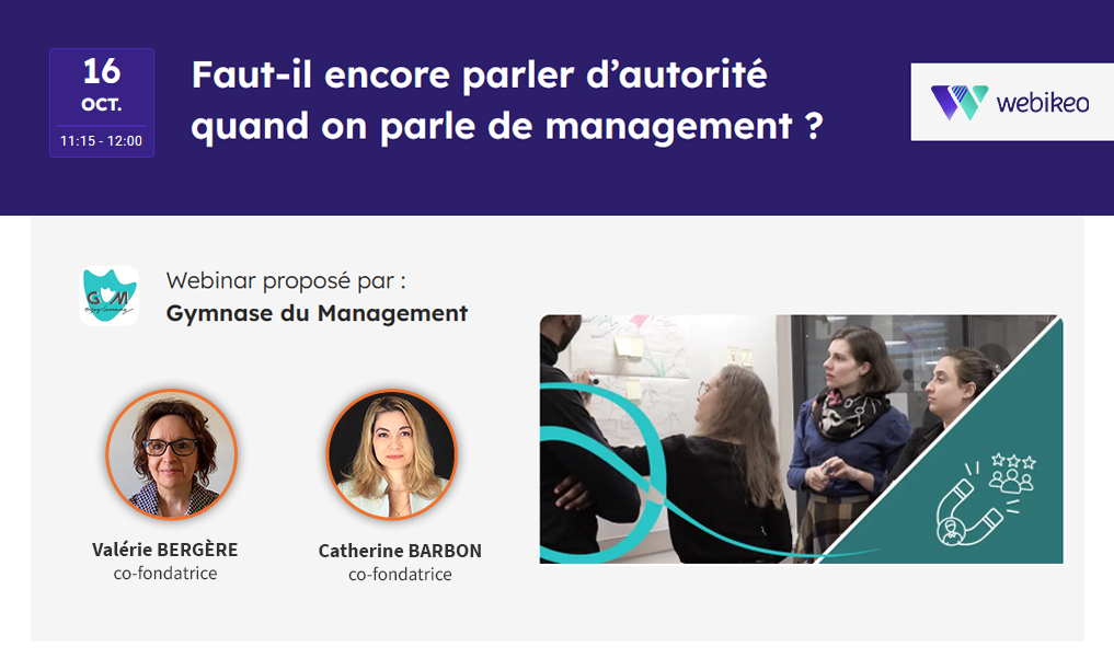 En ce dernier trimestre 2025, le Gymnase du Management poursuit l'animation de webinaires thématiques sur sa chaîne Webikeo, avec un second sujet prévu pour le jeudi 16 octobre autour de la question de la relation managériale et de l'autorité.