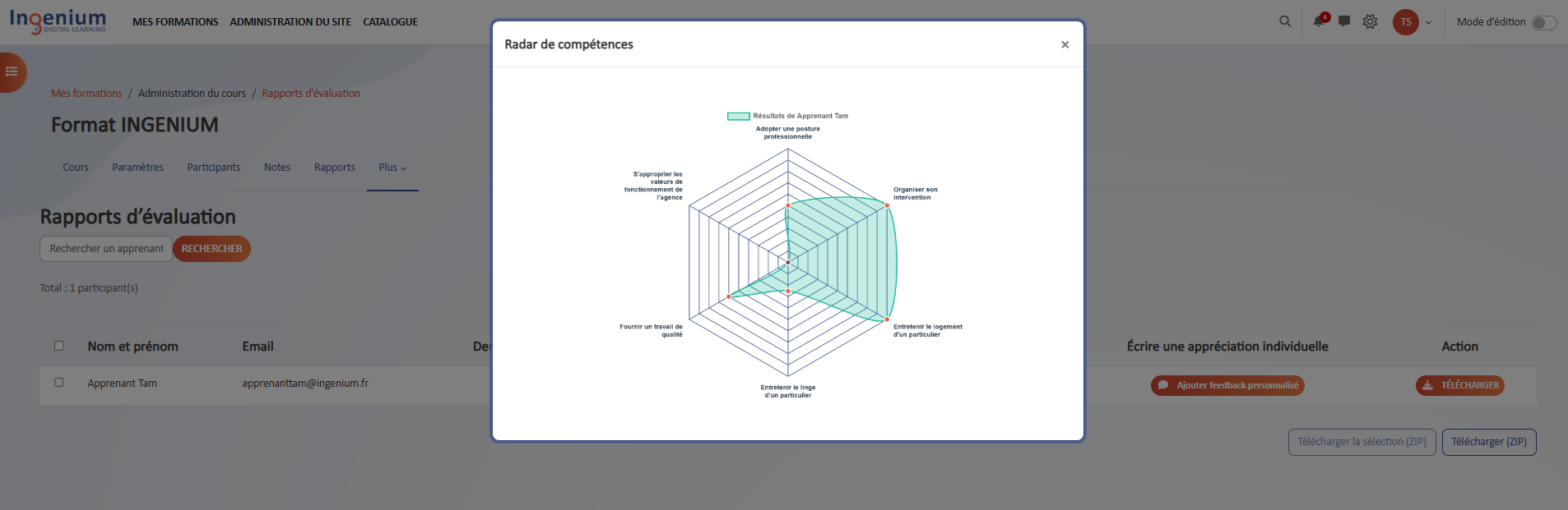 Notre nouveau plugin LearnRadar apporte une réponse concrète à ces enjeux : il transforme le test en un véritable outil d’analyse et d’aide à la décision pédagogique, tout en ajoutant une dimension visuelle très parlante pour les apprenants.