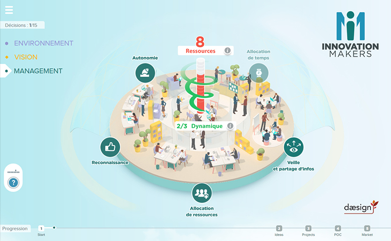 Innovation Makers est un serious game destiné aux managers et équipes dirigeantes des organisations souhaitant insuffler l’esprit et les méthodes d’innovation à leurs équipes. Conçu et réalisé grâce à un financement en crowdfunding et la participation d’experts métiers de Natixis, PwC, BPCE, Alstom et BNP Paribas, Innovation Makers confie au joueur une mission de management au sein d’une entreprise engagée dans une démarche d’innovation. Il apprend à créer le climat d’innovation propice à l’amélioration de la performance globale, à guider ses collaborateurs et conduire un projet innovant, de la génération d’idées à la mise en marché.